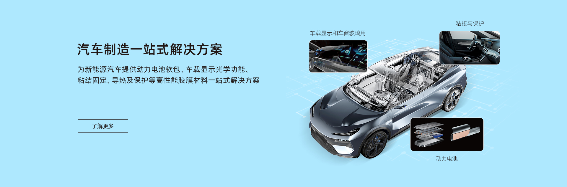 致力于為汽車制造、消費電子、智慧顯示端口等行業(yè)客戶提供包括新能源材料、電子功能材料、光電顯示材料、有機硅材料在內(nèi)的產(chǎn)品研發(fā)、生產(chǎn)、銷售于一體化服務,建立了專業(yè)的市場營銷與技術服務團隊,為客戶提供高性能膠膜材料一站式解決方案。